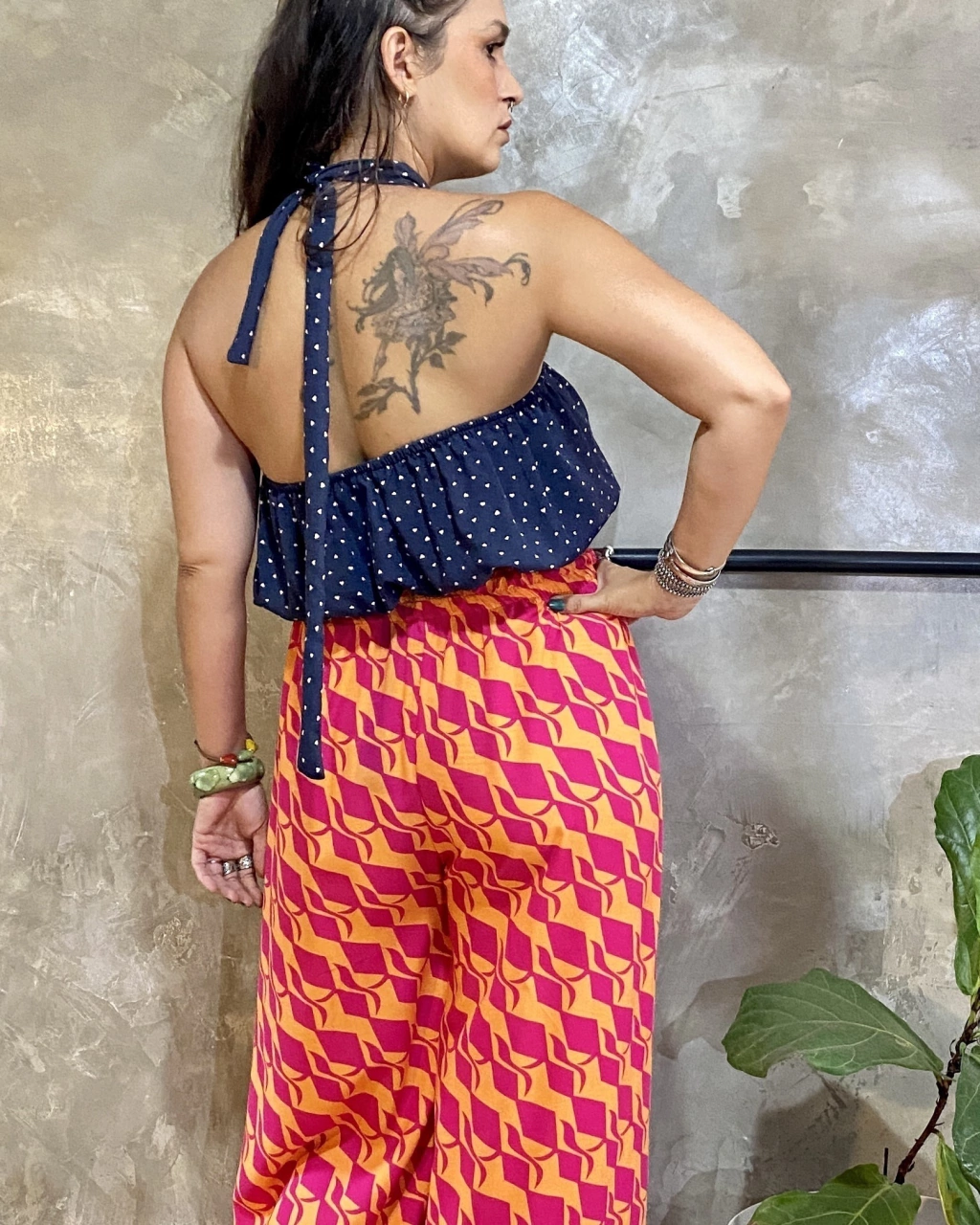 Os croppeds Tropicália são peças únicas confeccionadas de forma artesanal com acabamento em elastico na parte superior e inferior, os tecidos são leves, diferentes e exclusivos.