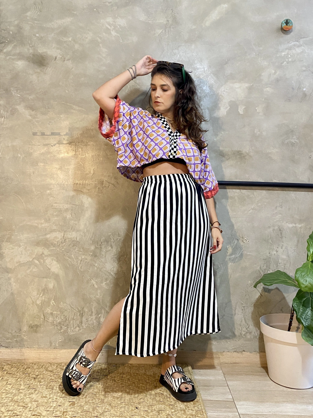 Compre aqui este lindo cropped kimoninho na estampa retrô lilás, confeccionado em viscolinho.