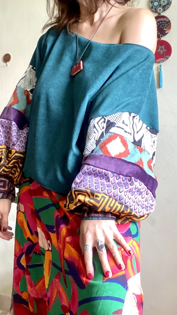 Lado A: Confeccionado em cotelê na cor azul petóleo e manga colorida com upcycling de varios tecidos.