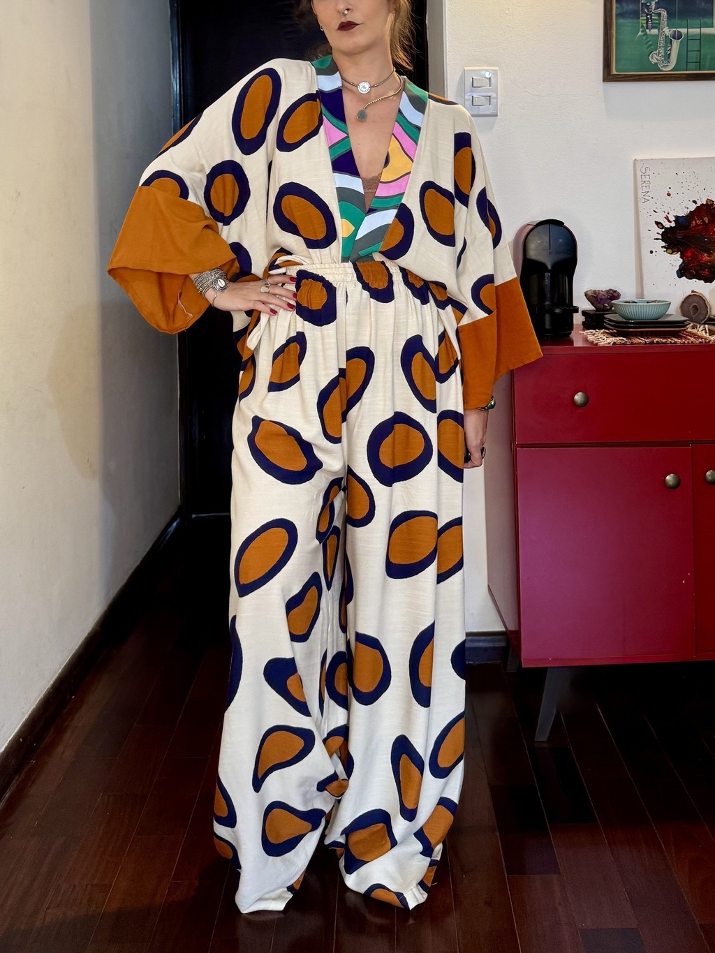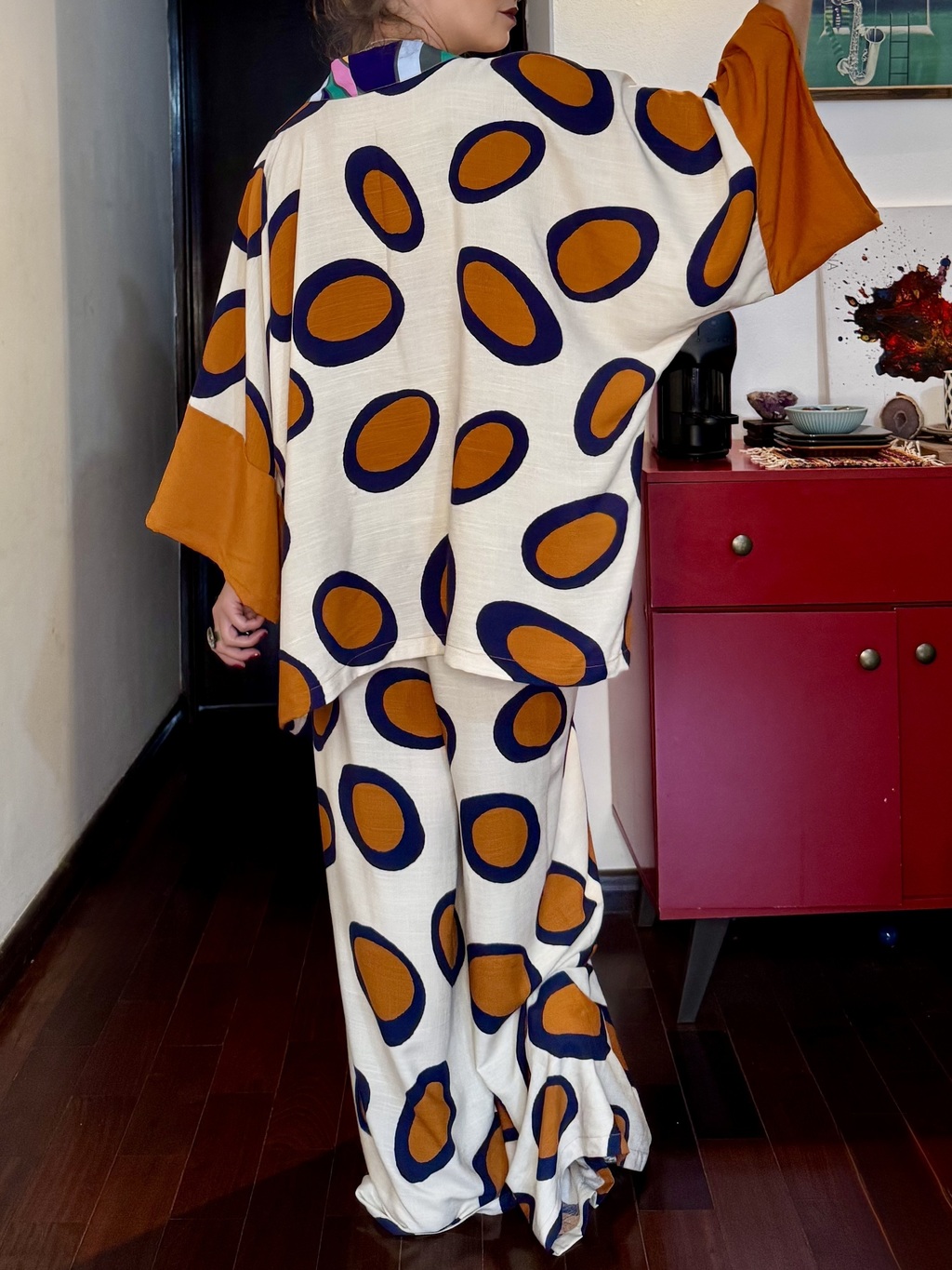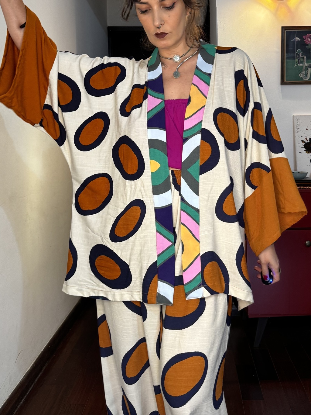 Kimono Geleia Geral confeccionado em viscolinho na estampa Novello na cor branca, ocre e marinho, borda em viscose javanesa e mangas em viscolinho. Acompanha também um cintinho para ser usado fechado ou como bata/vestido.