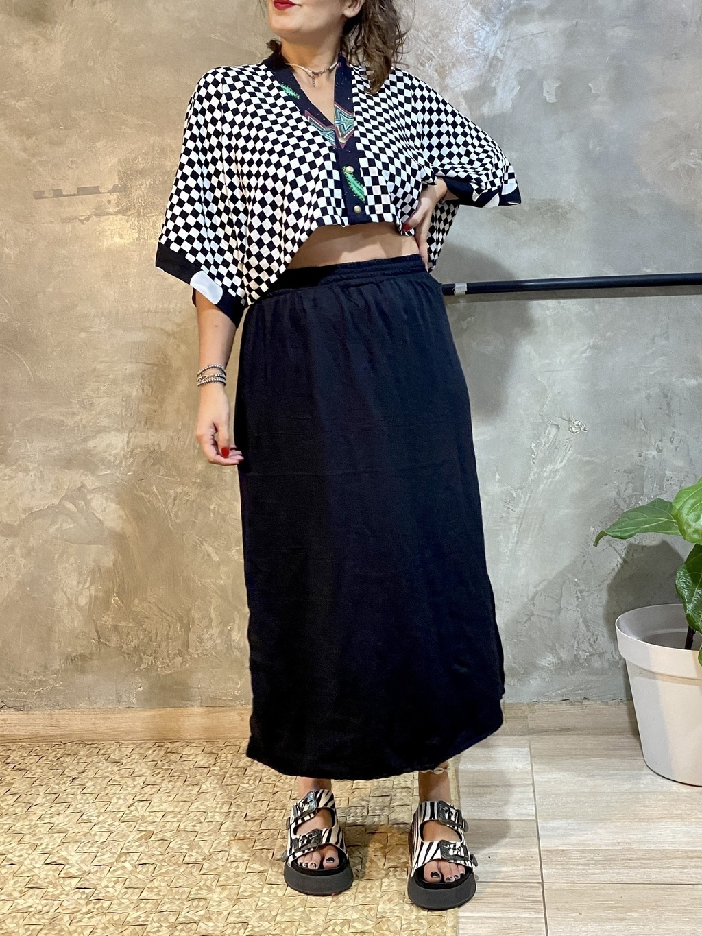 Compree aqui esta linda saia midi, confeccionada em viscolinho, cor preta.