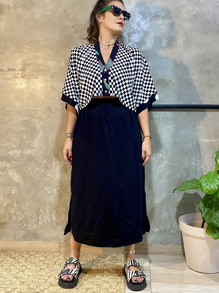 As saias midi Tropicália garantem conforto e praticidade no seu look do dia!