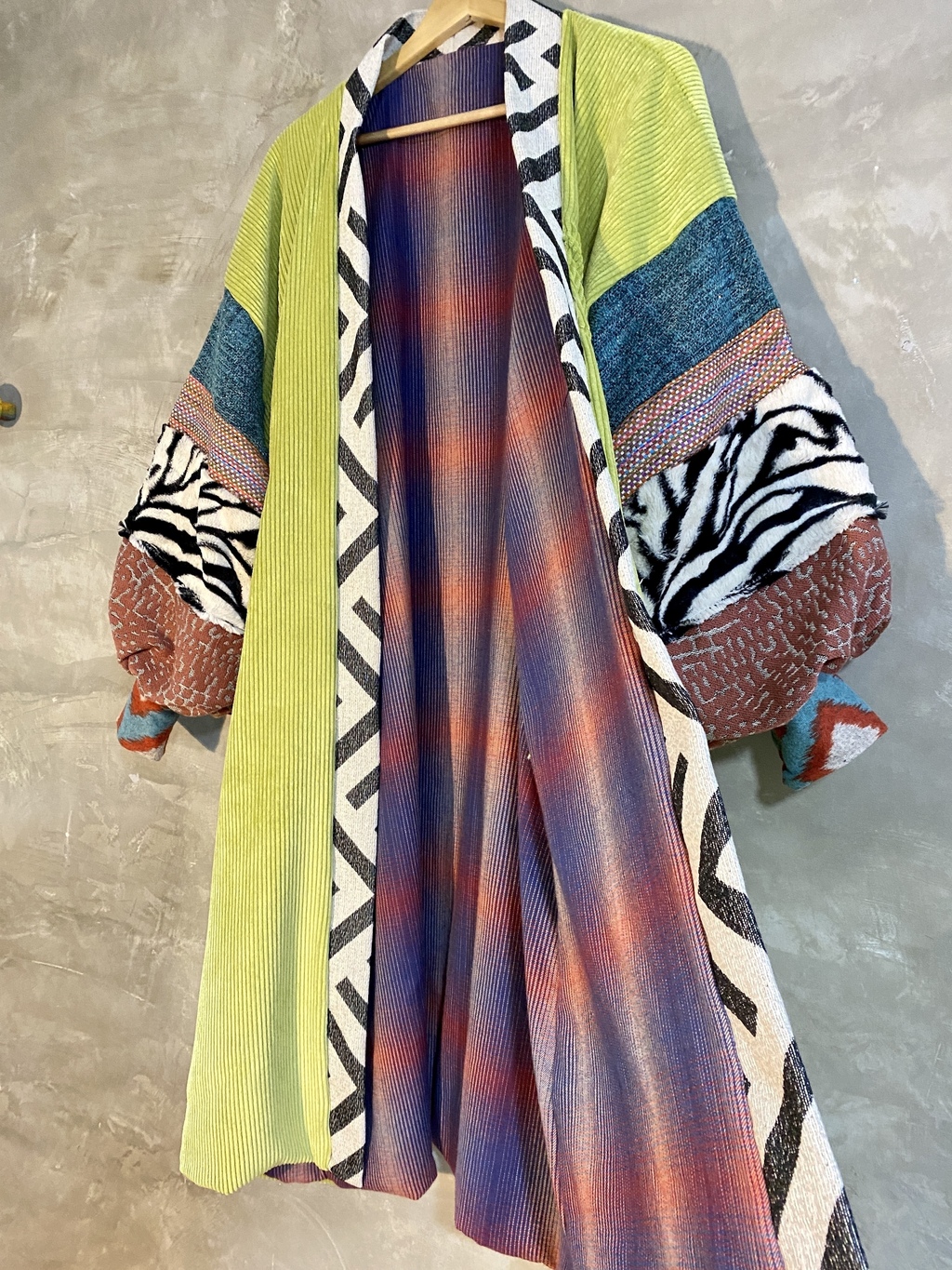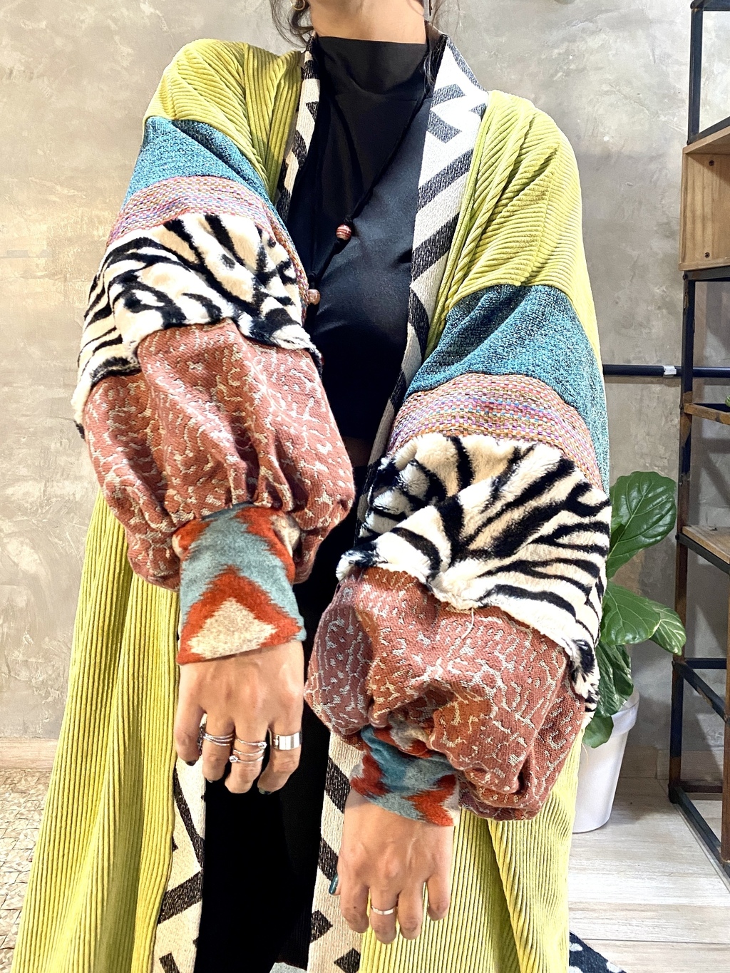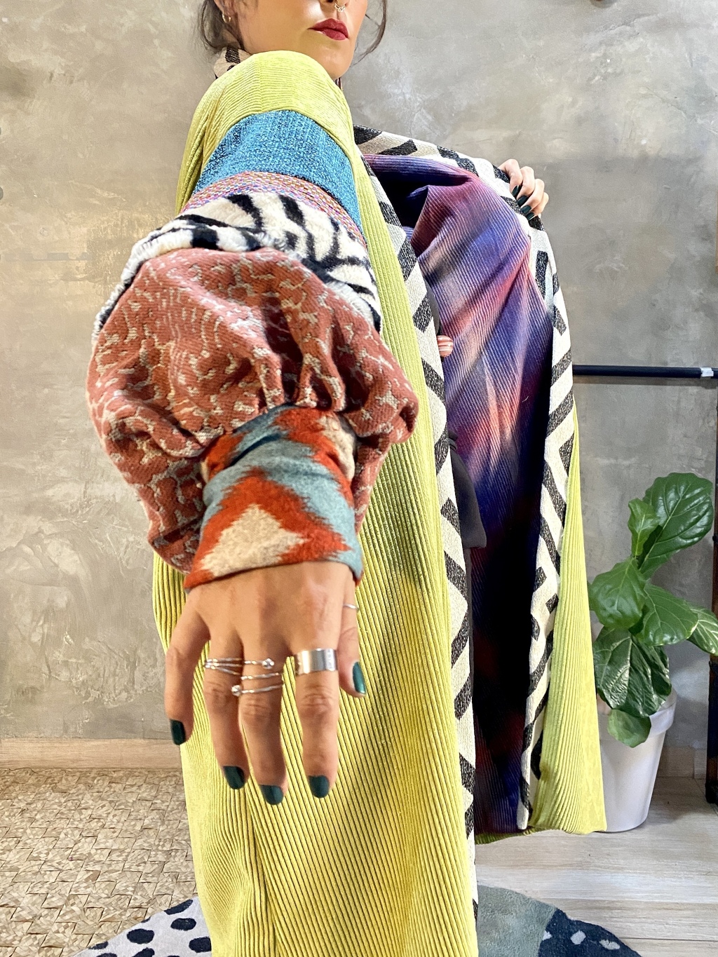 LADO A: Confeccionado em cotelê na cor limão e nas mangas upcycling de recortes têxteis em vários tecidos.