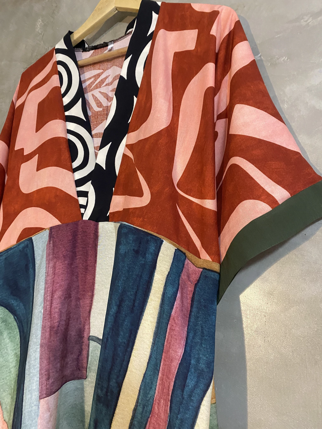 Vestido modelo camisetão com decote em V e detalhes em estampas diferentes, e com um detalhe que muda tudo, puxando sua cordinha na cintura ele fica franzido e muda totalmente de modelo, deixando a cintura marcada e com outro caimento, comprimento midi, variando entre joelhos e meio da canela, confeccionado artesanalmente em viscose estampa terra na parte de cima, viscose na estampa aquarela na parte de baixo, detalhes do vestido em viscose maquinetada na gola e viscolinho verde militar nas mangas.