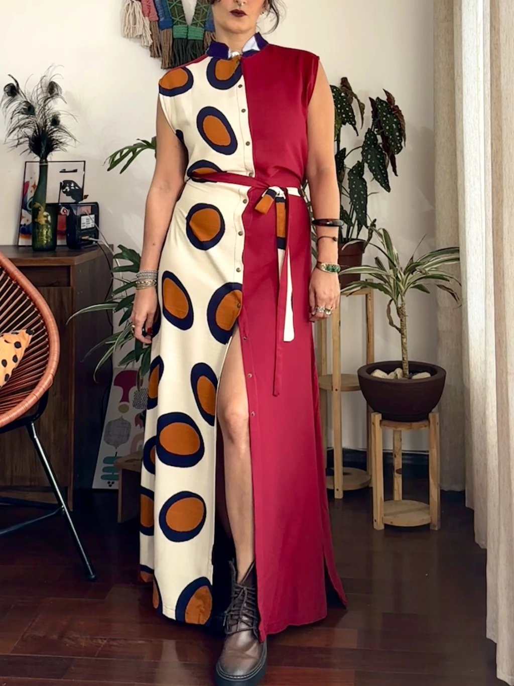 Vestido modelo longo regata com gola padre e botões, detalhes em estampas diferentes, cordão para ajuste nas laterais, deixando a cintura marcada e com outro caimento, comprimento longo, confeccionado artesanalmente em Viscolinho na estampa novello e viscolinho na cor bordô, detalhes do vestido em viscose javanesa, podendo usar com os botões fechados ou abertos na região que prefeir, podendo ser usado aberto ou parcialmente fechado como terceira peça ou fechado como vestido.